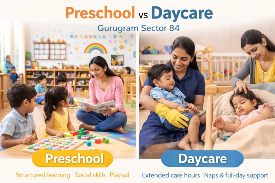 Many parents in Gurugram Sector 84 are working professionals and often wonder whether to choose a preschool, a daycare, or a combination of both.